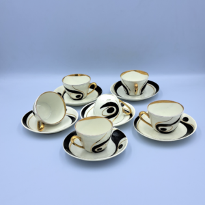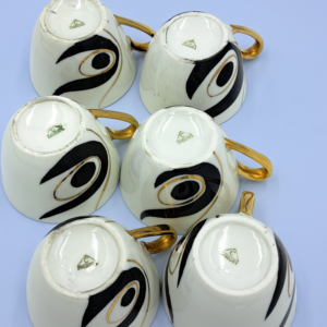 • Wymiary: dzbanek wys. 21,0 cm, szer. 22,0 cm, filiżanki wys. 4,5 cm, śr. 6,5 cm, spodki śr. 11,5 cm;