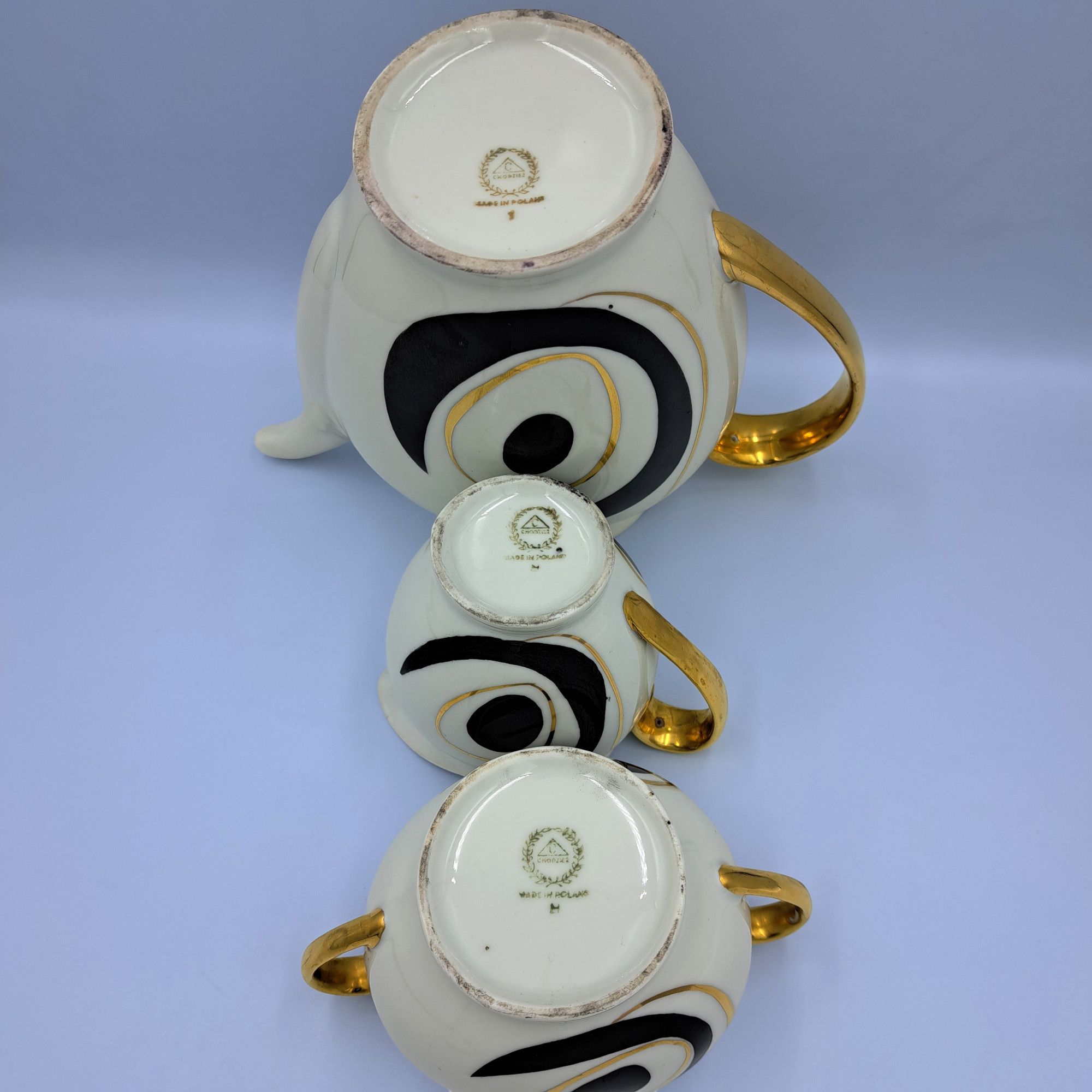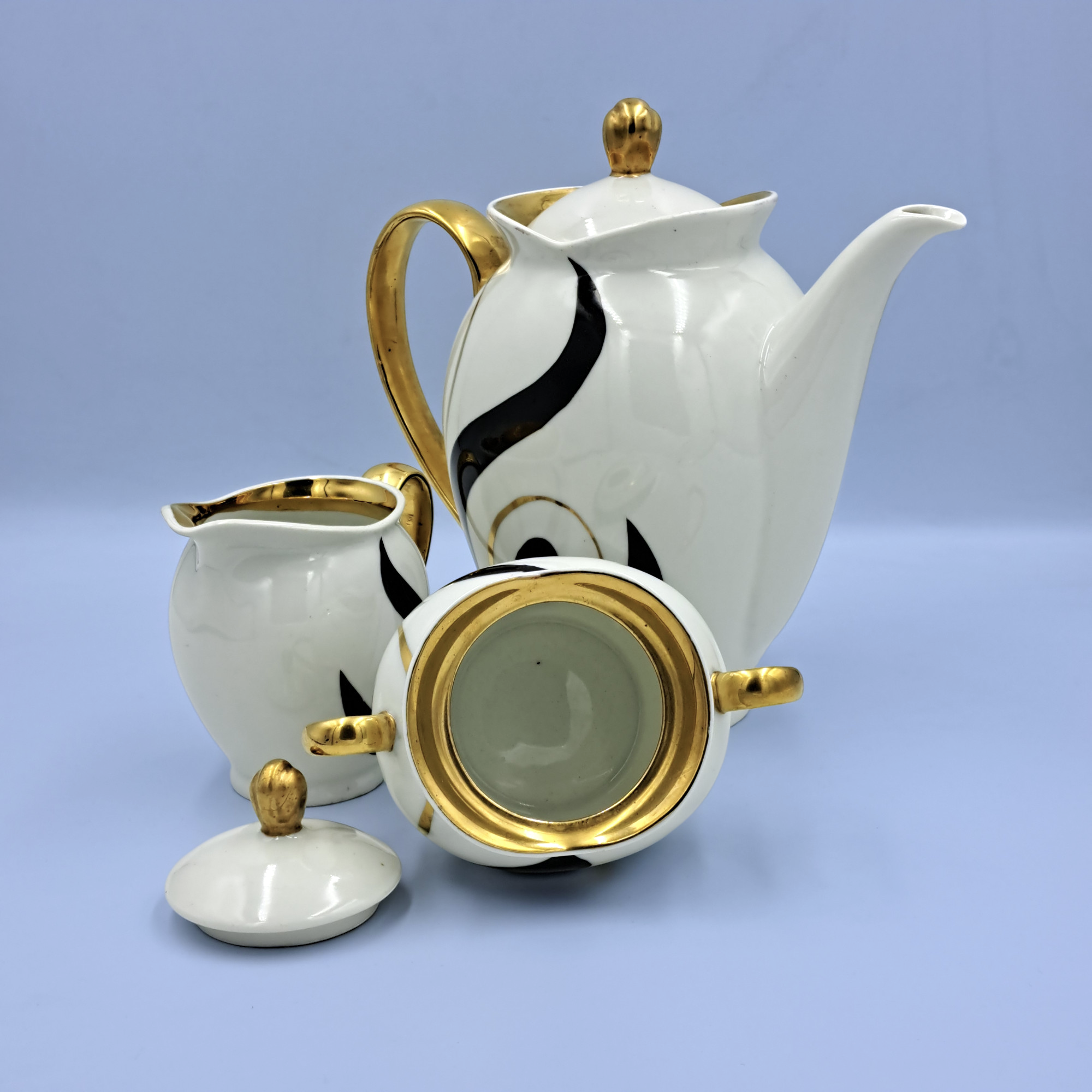 • Bardzo dobry stan, jedynie na wylewie mlecznika rysa (pęknięcie) prawie niewidoczne, nieznaczne przetarcia na uszkach filiżanek od spodu;